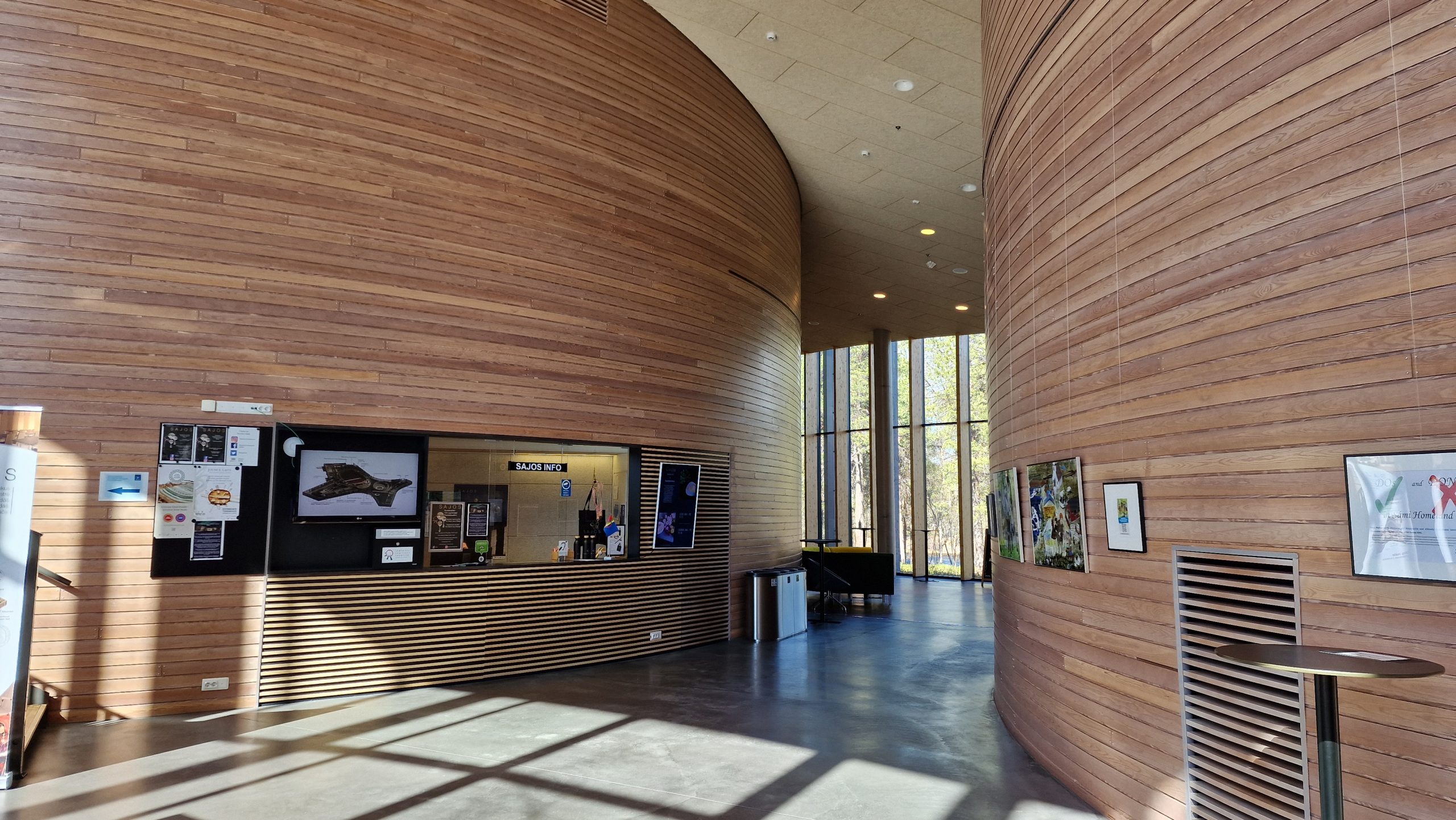 Vor dem Gebäude stehend bekomme ich Zweifel, ob es sich tatsächlich um ein Museum handelt. An den Hinweisschildern fehlt das finnische „Museo“, denn so viel habe ich bereits gelernt. In großen Lettern prangt an der Eingangstüre „Sajos inari“. Auch aus der Nähe und beim Eintreten zeigt sich mir eine dreiachsige Symmetrie mit einem hellen, klaren und modernen Erscheinen. Ich bemühe meinen Übersetzer und siehe da, ein Museum ist dies wahrhaftig nicht. Es handelt sich eher um das Gegenteil. Ich befinde mich im Kultur- und Regierungsgebäude des Samenlandes. Im Zentrum befindet sich ein zylindrischer Raum, in dem das „Parlament“ tagt und in dem die wichtigen Entscheidungen getroffen werden. An der Außenwand wird der gewünschte Umgang der samischen Kultur und Natur thematisiert. Insbesondere das respektlose Eindringen der Touristen in die Privatsphäre und ganz besonders die Fotografierwut der Besucher nimmt man in dieser Ausstellung aufs Korn.