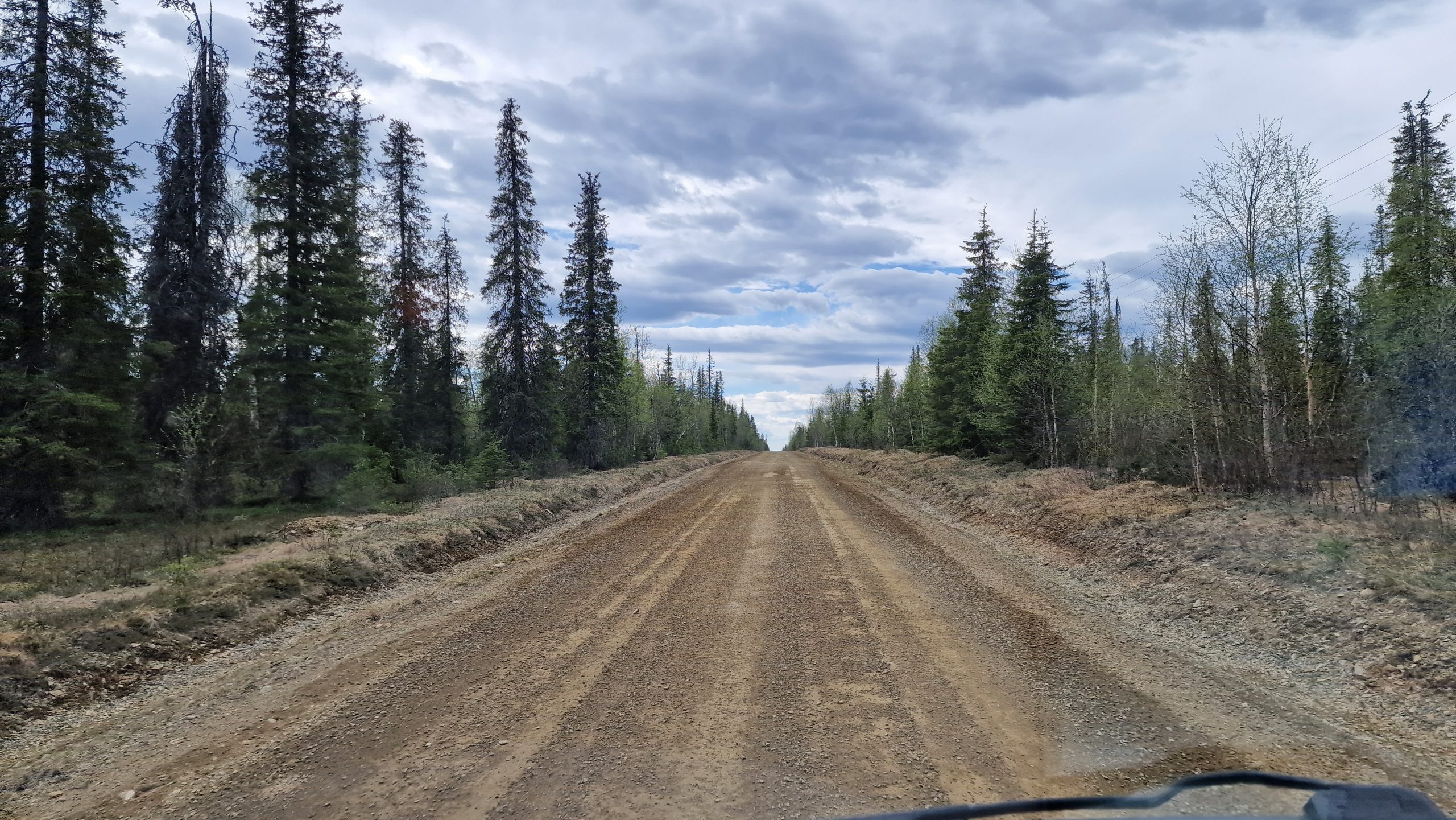 Nicht weit möchte ich heute fahren. Es sind knapp einhundertsechzig Kilometer. Ich werde dennoch vier Stunden bis dorthin benötigen. Die letzten80 Kilometer werden noch einmal schwierig. Der Asphalt endet und von nun an geht es auf Schotter weiter. Irgendwie erinnert mich das alles an meine Kanadareise 2022. Schotterstraßen, unendliche Wälder, weite, oft eintönige Landschaften. Nur etwa einhundert Kilometer bin ich gefahren und schon hat sich die Vegetation grundlegend geändert. In den Birken zeigt sich inzwischen der frische Frühling. Die Tundra hat ihr eintöniges Braun gegen ein noch blasses Grün eingetauscht und die ersten gelben Blümchen strecken ihre Köpfchen aus dem Unterholz. Es ist inzwischen richtig warm geworden. Die Sonne brennt vom Himmel, aber es ist keine gute Sonne. Meine Mutter hätte sie als eine falsche Sonne bezeichnet, denn sie bringt keine Wärme, sondern sengende Hitze, verheißt nichts Gutes, vielleicht Regen, vielleicht gar Gewitter, auch die Wolken weisen eine seltsame Linsenform auf, wie ich das nur vom Föhn kenne. Föhnwetter