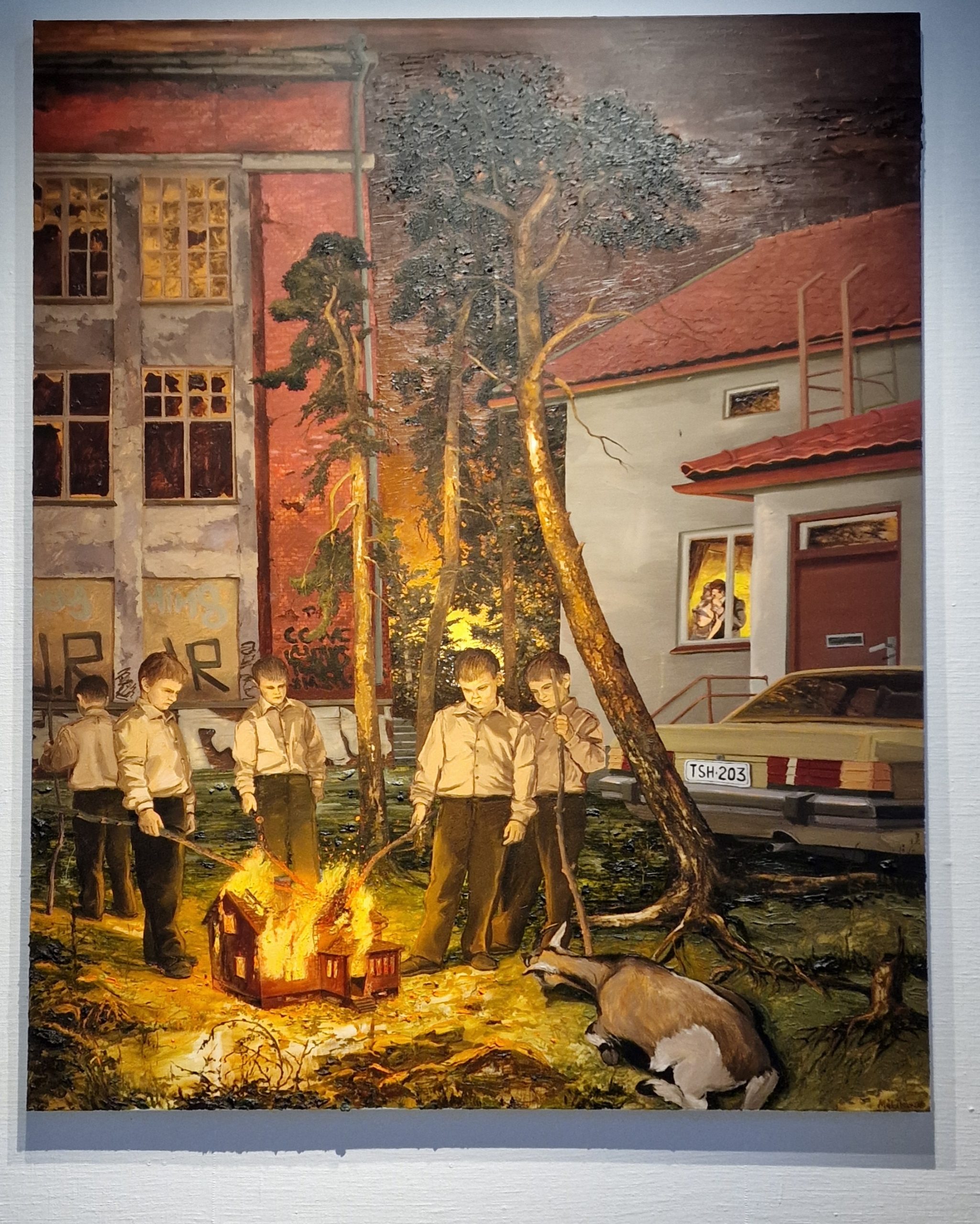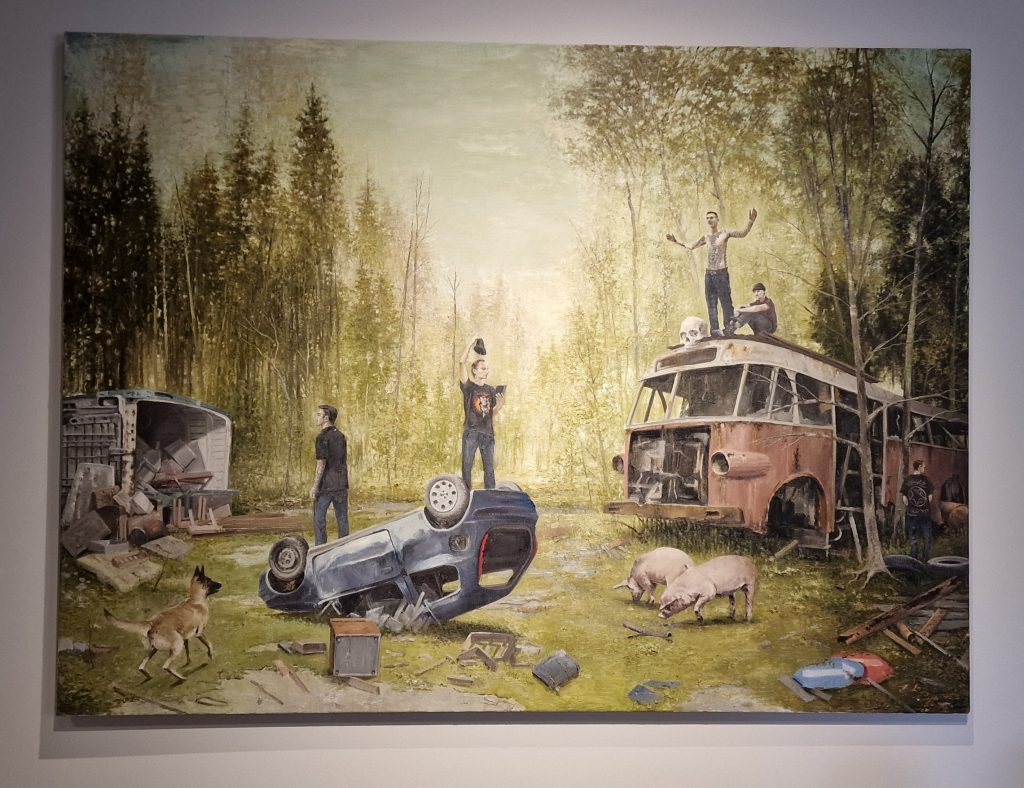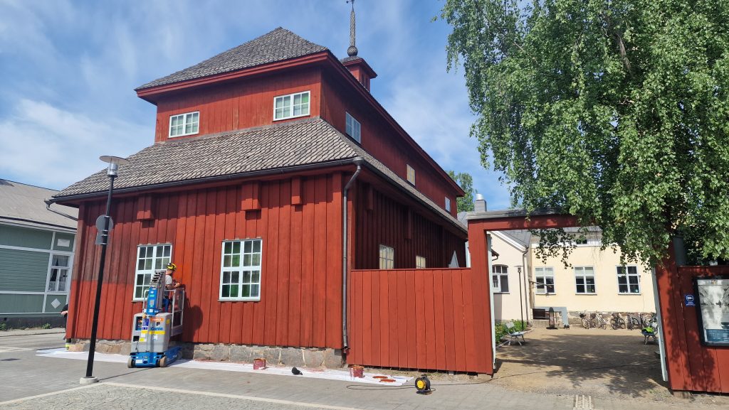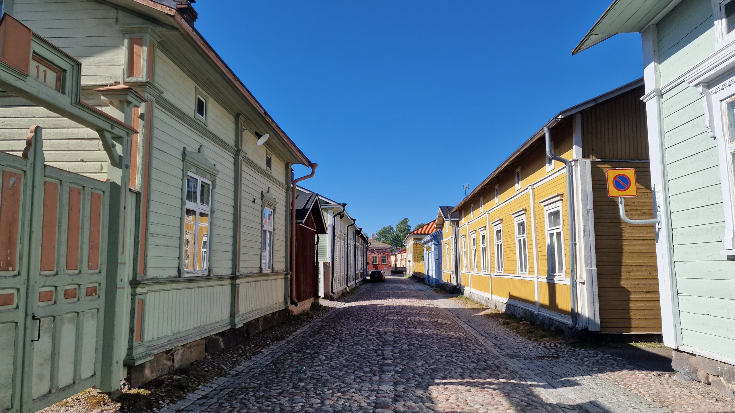 Von Vaasa aus fahre ich dann nach Rauma weiter, einer Stadt, die zum Weltkulturerbe ernannt wurde. Kaum bin ich am Abend angekommen, da verfärbt sich der Himmel schwarz und es gießt in Strömen. Trotzdem beschließe ich, einen ersten Rundgang zur Orientierung durch die Stadt zu machen. Heute bin ich verwegen und gönne mir einen Wein in der Bar. Mit zehn Euro fünfzig bin ich dabei und bekomme dafür ein null zweier Glas eines mäßigen Chardonnay. Ich versuche es gar nicht erst ein Gespräch zu beginnen, sondern marschiere brav zurück zu meinem FidiBus, lese noch ein wenig und fühle mich wohl, während draußen ein kräftiges Gewitter tobt. Die Sonne weckt mich am nächsten Morgen und ich beginne meinen Rundgang. Die Stadt ist tatsächlich etwas Besonderes. Die bunten Holzhäuser reihen sich links und rechts der teils engen Gassen und auf dem Marktplatz haben sich neben einigen wenigen Verkaufsständen die Infostände, die um die Wähler für die Europawahl buhlen. Am Stand der finnischen Grünen bietet man mir eine Bratwurst an, die ich gerne annehme, zumal ich noch nicht gefrühstückt hatte. So verdient das Café heute leider nur an einem Kaffee an mir. In der Heilig-Kreuz-Kirche werde ich aufmerksam auf eine Ausstellung des finnischen Künstlers Jarmo Mäkilä, die gestern im Kunstmuseum eröffnet wurde. Sie beeindruckte mich durch ihre einerseits sehr realistischen Bilder und Skulpturen, aber auch durch den Umgang mit Licht. Der Künstler verarbeitet in seinen Bildern und Objekten seine Kindheit auf eine beinahe mystische Weise, wobei mir auffällt, dass die Gesichter der dargestellten Personen stets sein eigenes Gesicht zeigen. Bedauerlicherweise ergeht es der hübschen kleinen Altstadt aber wie so vielen anderen historischen Städten auch. Sie hat sich voll dem Tourismus verschrieben. Souvenirläden, unzählige Cafés und Boutiquen prägen das Bild der Stadt. Am Nachmittag drängen sich die Touristen durch die schmalen Gassen und ich bin froh, dass ich mich schon früh am Morgen auf den Weg machte, so fand ich die Stadt noch recht friedlich vor. Meine Weiterfahrt verschiebe ich auf den nächsten Tag.