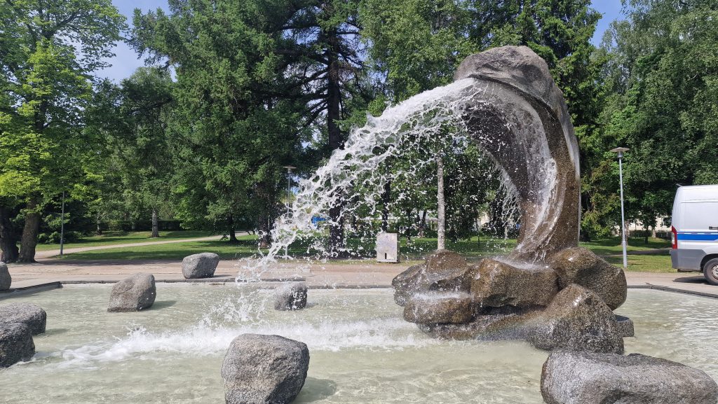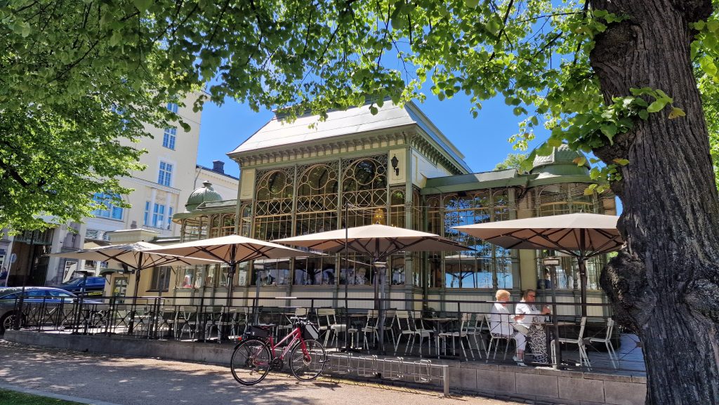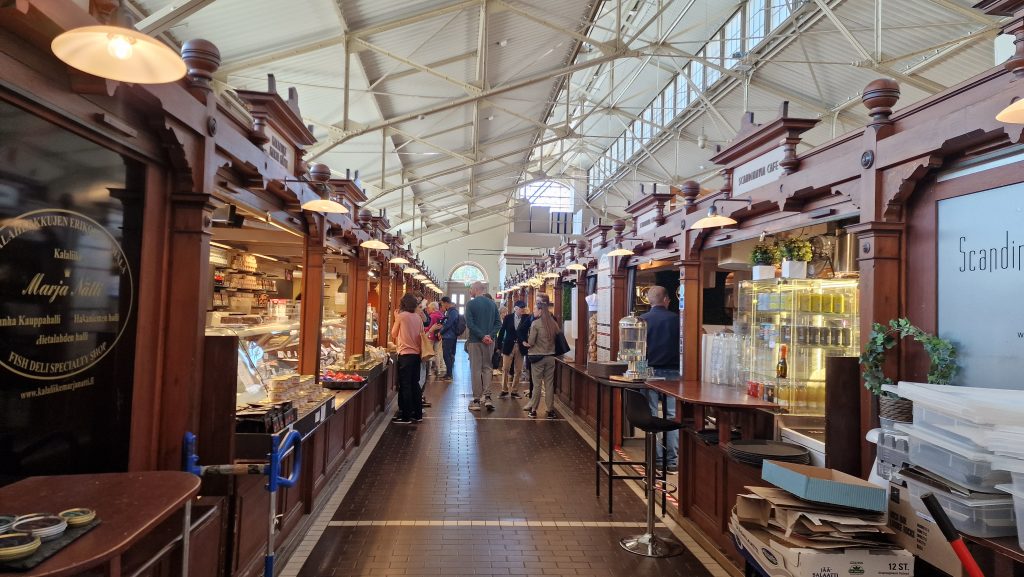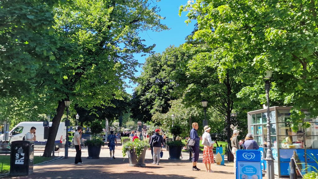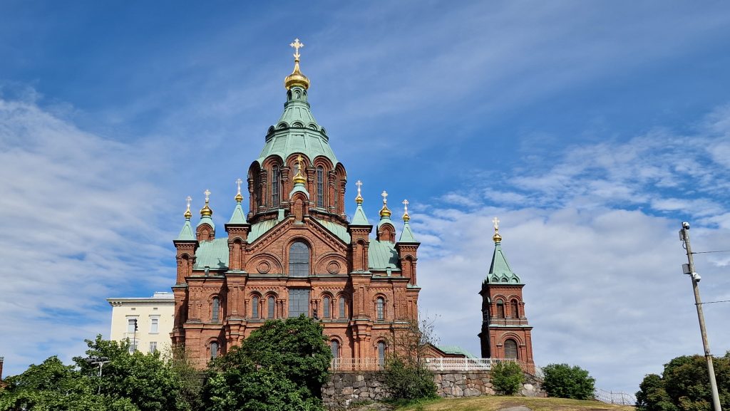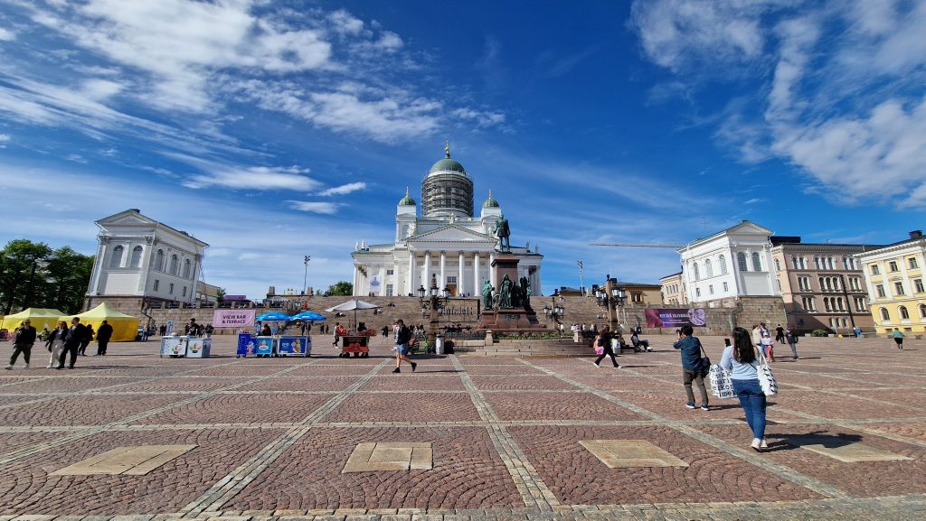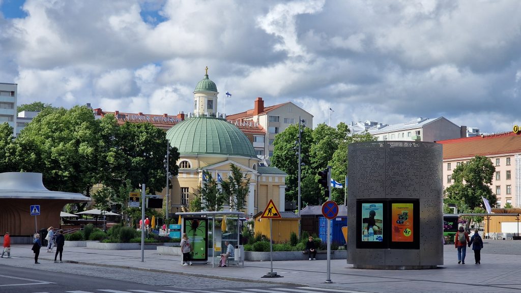 Dies sind vier parallel verlaufende Straßen, die Shopping-Mall. Zwischen ihnen befindet sich ein schöner Park und da das Wetter heute schön ist, ist der Park voller Menschen, die die Sonnenstrahlen einfangen. Ich würde ja gerne ein Eis essen, aber bei vier Euro fünfzig für eine Kugel sträubt sich selbst mein innerer Schweinehund. Vorbei geht es an dem Theater, einer weiteren Markthalle, schöner als die am Hafen gelegene, aber auch sie beherbergt ausschließlich diverse gastronomische Betriebe. Ich gönne mir ein Bier und mache mich auf den Rückweg. Durch immer wieder neue Querstraßen komme ich zum Jugendstil Viertel. Es ist nicht gerade sehr viel, aber es ist dennoch beeindrucken. Um sieben Uhr bin ich wieder in den Esplanaden und dem Park und da heute auch Musik-Sommerfestival ist, spielt in einem Konzertpavillon eine finnische Folk Band. Sie haben gerade angefangen und die Musik gibt mir ein gutes Gefühl. Ich bleibe bis zum Schluss. Streune dann noch ein wenig durch die Gassen zur orthodoxen Kirche, die hoch über der Stadt auf einem Fels errichtet wurde, von dort zum Domplatz und dann zurück, durch einen in den Fels geschlagenen Tunnel in die U-Bahnstation der Metro. Um zehn Uhr falle ich todmüde und mit schmerzenden Füßen und Knien in meinen FidiBus. Es war ein schöner, wenngleich anstrengender Tag. Mein nächstes Ziel ist Tallinn. Also dann, Gute Nacht.