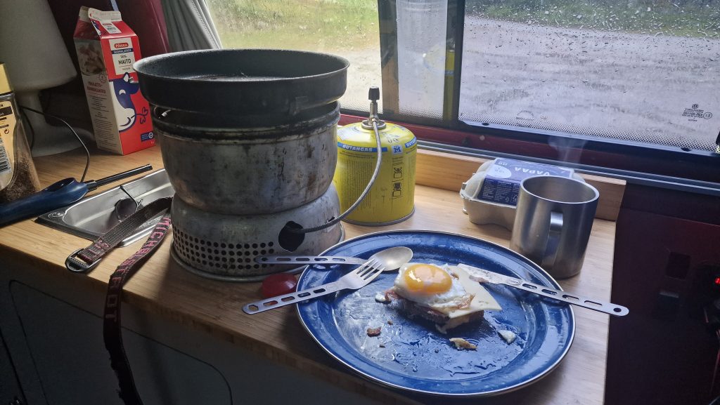 Folgerichtig verlasse ich meinen Platz und finde in der Nähe eines Badestrandes, ebenfalls mit schöner Promenade einen neuen Platz für die Nacht. Mein Abendessen, Nudeln mit Tomatensauce und geröstetem Schinken, gratiniert mit feinstem Emmentaler aus den Höhlen des lokalen K-Marktes entstand mit einigen Laufeinlagen. Etwa fünfmal musste ich zwischen FidiBus und meiner Küche hin und her laufen, bis ich endlich alles beisammen hatte, bis auf das Feuerzeug, dass meinem einflammigem Gasherd zu einer Zündung verhelfen sollt, lag noch in FidiBus‘ wohl sortiertem Küchenfach. Ich laufe ein sechstes Mal. Geschmeckt hat es nach der vielen Lauferei dennoch. Ich trauere dem Blick auf der Pier nach, mache einen langen Spaziergang in die Stadt, zurück zu meiner Pier. Restaurants, Bars, Cafés, alles geschlossen und keine Mopeds weit und breit. So gegen 11 Uhr nachts fahre ich also wieder zurück. Ruhe, absolute Ruhe und so sollte es dann auch die ganze Nacht bleiben.