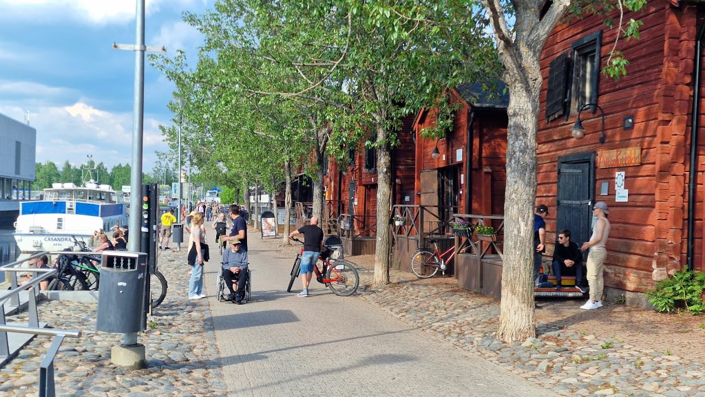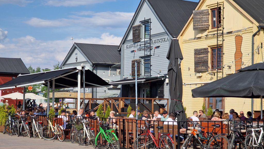Schon als ich auf der E8 nach Oulu hineinfahre, ist es klar, ich nähere mich einer Großstadt. Es herrscht reger Verkehr, doch Dank Google Maps bin ich rasch in der Innenstadt. Als Erstes fällt mir auf, dass die Straßen voller Menschen sind, dass sie draußen in Cafés sitzen und dass es hier sehr viele junge Menschen gibt. Sofort bekomme ich Lust, mich hier unter die Menschen zu mischen. Einen Parkplatz finde ich schnell in der Nähe eines Kiikeli-Parks. Einer hübschen kleinen Grünanlage, von der aus man über eine Brücke nach Elba gelangt. Ja so schnell gehts dann doch nicht. Wahrscheinlich hat man diese kleine Insel wegen Ihrer Umrisse nach der großen Schwester benannt. Keine 5 Minuten vom Parkplatz entfernt, wurde das Ufer eines Kanals treppenförmig angelegt und überall saßen auf den Treppen junge Menschen. Sie redeten, lachten und machten Musik. In den alten Lagerhäusern waren Lokale, Boutiquen und Bars. Auf dem Vorplatz boten Foodtrucks ihre Produkte an und es war ein erfrischend fröhliches Treiben. Es war laut! Ja auch darüber kann ich mich freuen, wenn ich nur lange genug mit mir allein war. Es ist ja nicht der donnernde Lärm, sondern es ist, wie immer, wenn viele Menschen zusammen sind, eine gesellige Lautstärke, die vom Leben zeugt. Es macht mir Spaß, mich durch die Menschen zu bewegen. Die heute anscheinend besonders fröhlich sind. In einem alten zu einer Bar umgebauten Schuppen findet ein Live-Konzert statt. Da muss ich hin, zumal es kostenlos ist. Aber dann kommt es doch nicht zu dem Konzert. Immer wieder bricht der Bassist ab und mäkelt an seinem Monitor-Lautsprecher herum. Dann bekommt er Streit mit den übrigen Bandmitgliedern, als Erstes verlässt die Leadsängerin die Bühne und kurz darauf auch der Drummer, nicht ohne dem Bassisten mit einer unfeinen Geste seines in die Luft gestochenen Mittelfingers anzudeuten, dass er die Meckerei satthat. Da steht er nun, der Bassist, zuckt die Schultern, murmelt etwas, für mich unverständliches in sein Mikro und packt zusammen. Ich trinke mein Bier aus und schlendere zurück zum FidiBus.