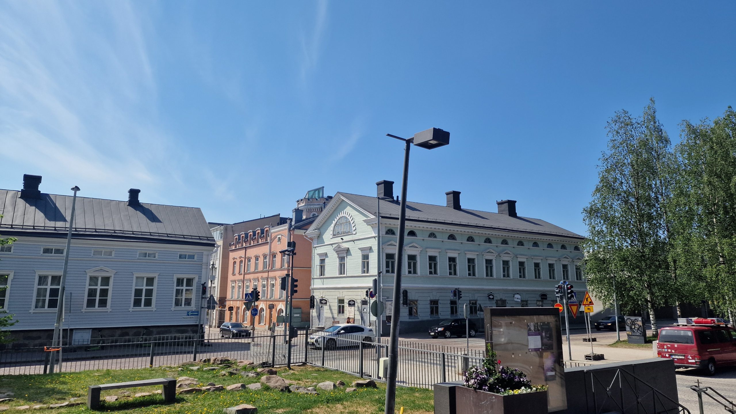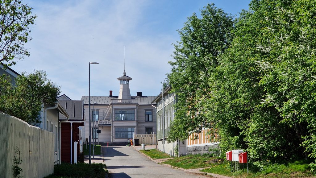 Am nächsten Morgen fahre ich also wieder nach Oulu. – Bei dem Namen Oulu fällt mir immer der Roman von Arto Paasilina ein, „Der heulende Müller“. Den hat man wegen seiner elendigen Schreierei und einigen verrückten Aktionen am Ende in die Irrenanstalt nach Oulu einliefert. – FidiBus wird wieder an seinem Platz abgestellt, dort hat er es um diese Zeit, es ist zehn Uhr am Morgen, noch recht schattig. Meinen Rundgang starte ich mit einem Besuch des alten Stadtteils von Oulu, der auf einer kleinen Insel Pikisaari liegt. Leider hat man hier die Hauptstraße komplett aufgebrochen, um Glasfaserkabel zu verlegen. Die Altstadt hat ihren Charme somit an die Baustelle verloren. Ohnehin ist sie nur sehr klein, genau genommen handelt es sich nur um eine Straße, und nach einer halben Stunde habe ich meine Schritte in jede Gasse gelenkt. Gerne hätte ich einen Blick in das Schifffahrtsmuseum geworfen, doch das ist bis zum 6. Juni geschlossen. So laufe ich wieder zurück, vorbei am Theater und an der sehr schönen Bibliothek, beide sind jedoch wegen Renovierung geschlossen. Das Technikmuseum ist ebenfalls vorübergehend geschlossen. Was ist los? Habe ich vielleicht das Schild übersehen „Suomi suljettu tilapäisesti remontin vuoksi – Finnland vorübergehend wegen Renovierung geschlossen“?
