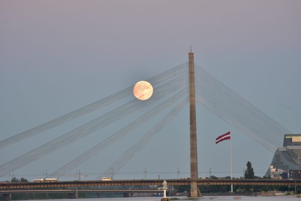 Halb neun trete ich dann endgültig den Rückweg an. Jetzt wird mir allerdings jeder Schritt zur Qual. Als ich mich eine dreiviertel Stunde später in meinen Sessel am Ufer der Daugava setze, möchte ich bis morgen nicht mehr aufstehen, wenn nicht in diesem Moment ein großer runder Vollmond mit seinem Marsch von der Burg der Altstadt, über die Vansu Brücke zu den neuen Hochhäusern ein faszinierendes Schauspiel lieferte.