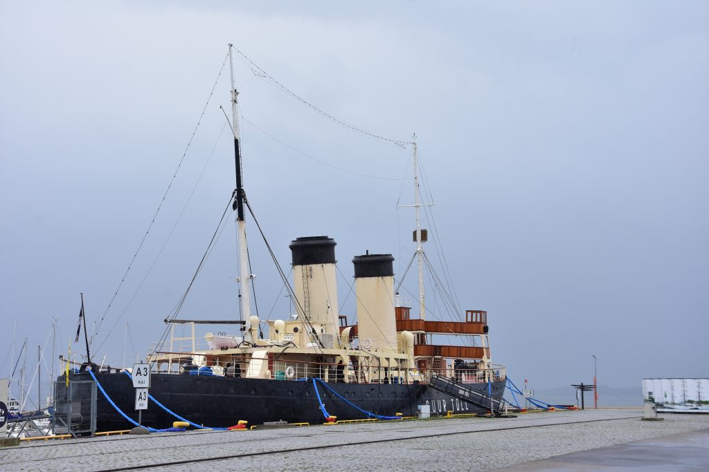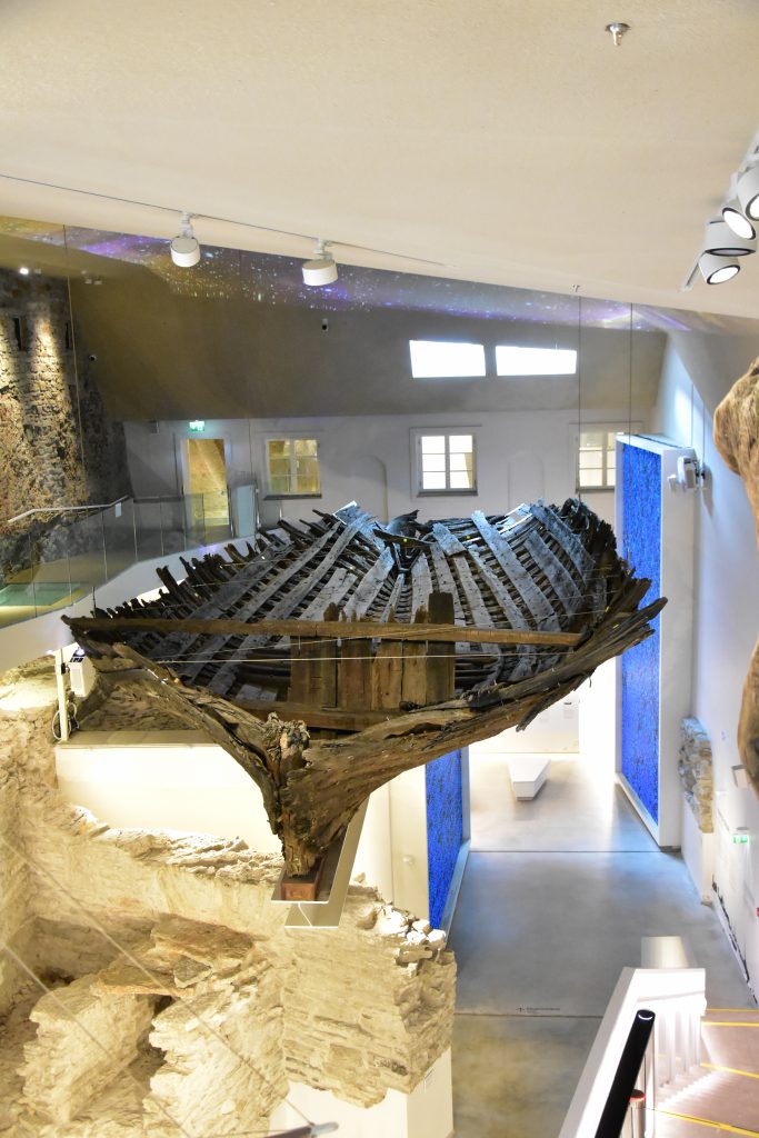 Ich beginne meine Besichtigung im Maritim-Museum, das sich im Turm der Stadtmauer, genannt „Dicke Margarete“. In diesem Museum wird mein Interesse auf eine ausgegrabene Kogge gelenkt. Besonders die Bergung interessiert mich, da das Wrack im Ganzen gehoben und provisorisch zwischengelagert wurde. In der Dokumentation fiel mir auf, das rings um das Wrack bis zu seinem Boden, die Erde weiß war und sich damit deutlich von dem umgebenden braungrauen Untergrund abhob. War das Gips, den man zu Stabilisierung verwendete um später leichter auch unter dem Schiff arbeiten zu können? Leider kann mir auch das Museumspersonal meine Frage nicht beantworten und so muss ich wohl ein wenig recherchieren. Das hebe ich mir für zuhause auf.